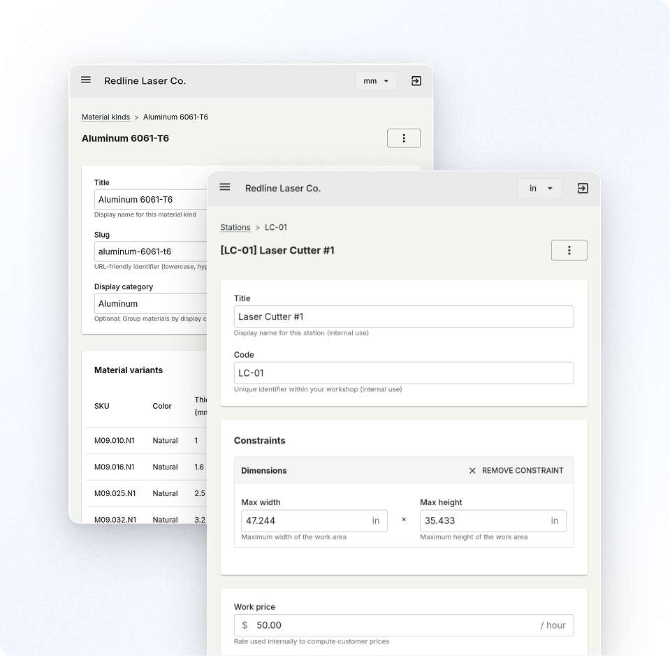 Set up your materials, lead times, pricing structures, and discount policies to match exactly how your workshop operates.